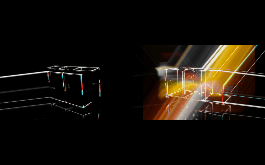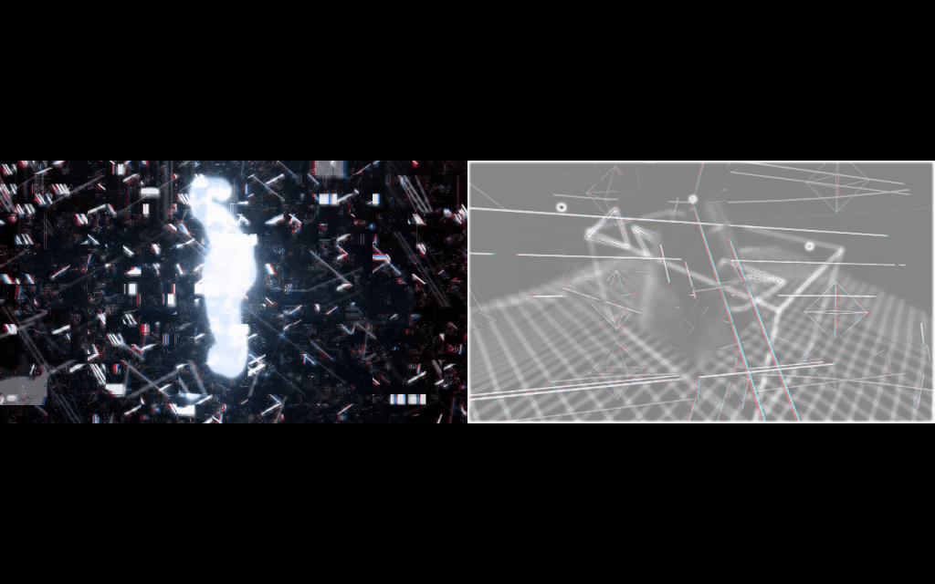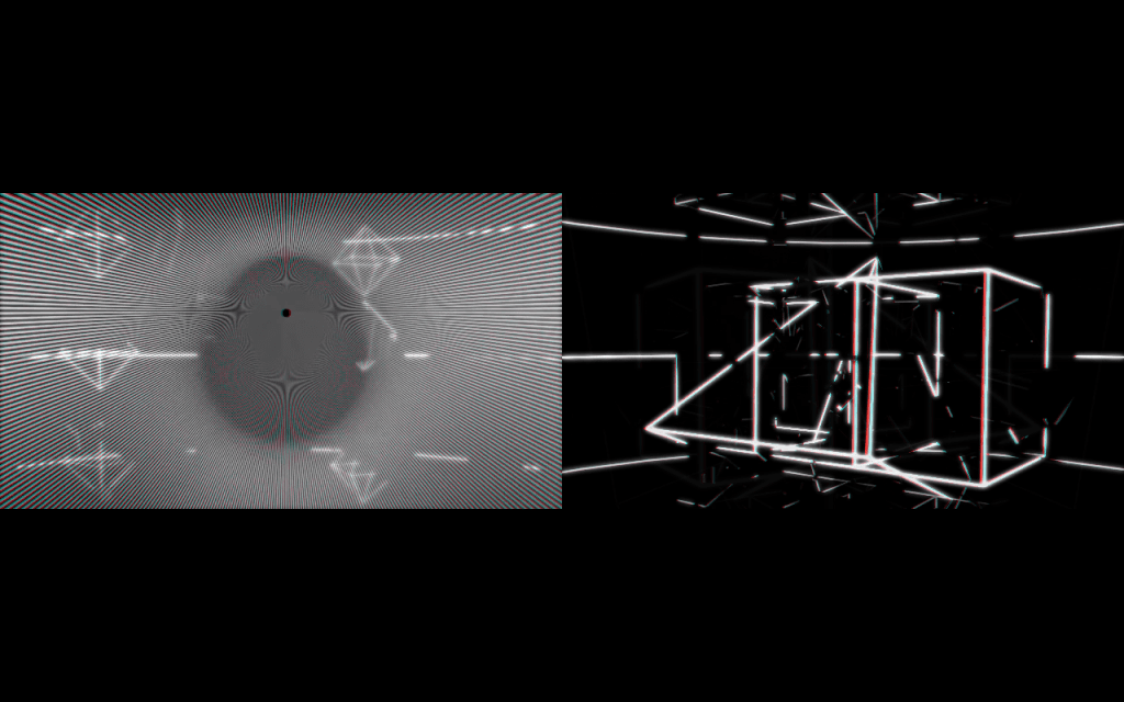 Imaginary Optics II incorporates stereoscopic anaglyph (3D, Red Cyan) image, analog video synthesis, 3D digital image synthesis, and real-time sound and image processing. These retro-futuristic works explore possibilities of audiovisual abstraction, through the hybridization of analog video synthesis, obsolete optical technologies and digital software.
